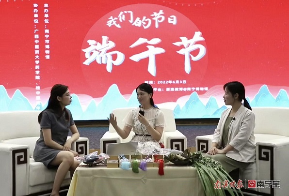 当天上午10点30分,应南宁市博物馆特别邀请,支部组织委员兼纪检委员涂冬萍副教授做客“我们的节日——端午节”云课堂,结合养生药膳及壮医药知识,介绍端午节的由来和习俗,并重点对蓝靛制衣、沐兰汤、挂艾叶菖蒲、缠五色线、佩戴香囊、喝雄黄酒、吃五色粽等古老的端午习俗所蕴含的医药文化进行讲解,分享实用的端午养生妙招,直播观看人数达3700人次,该直播课堂还经南宁晚报、南宁宝APP等媒体报道,获得良好的反响。
