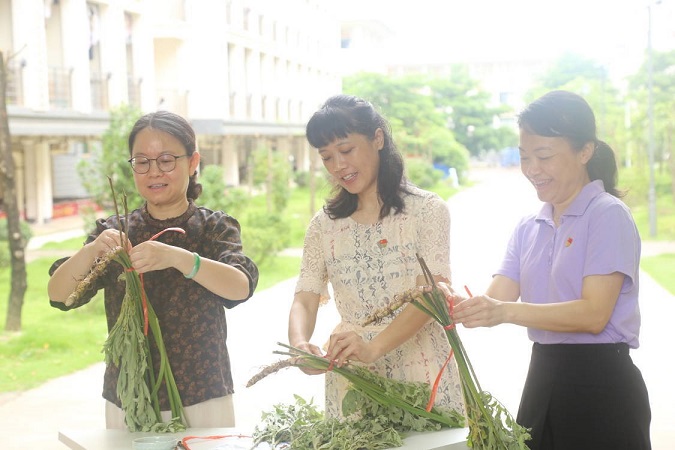 叶勇玲老师(左)、王柳萍老师(中)和曾春晖老师(右)展示捆菖蒲艾叶