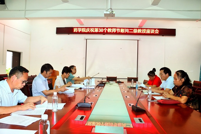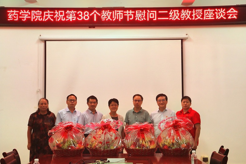 9月2日下午,在第38个教师节来临之际,药学院党政领导班子携工会亲切慰问二级教授,并召开座谈会。学院党委书记蒋林、主持行政工作副院长卢汝梅、工会主席李豫萍,秦华珍、黄荣韶、杨秀芬、谭勇等二级教授参会。