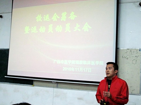 值我校一年一届的体育盛事——第三十三届运动会即将拉开帷幕之际,为了激发同学们参与的热情,保证各项筹备工作和训练工作顺利开展,瑞康临床医学院于2010年11月17日17:30在学校东梯一教室隆重召开了第三十三届校运会动员大会。瑞康临床医学院分团委汪国翔副书记、教务学生科郑光珊老师、各年级运动员代表及瑞康临床医学院团总支、学生会全体委员出席了本次大会。