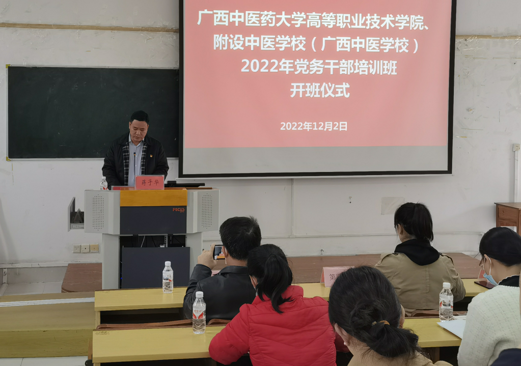 为深入学习贯彻党的二十大精神,加强基层党组织标准化规范化建设,提高新任党务干部业务素质和工作能力,12月2日-12月4日,高职院、附设中医学校党委在明秀校区基础楼西梯三教室举办学习贯彻党的二十大精神暨2022年党务干部专题培训班,高职院、附设中医学校新一届全体党支部委员参加此次培训班。
