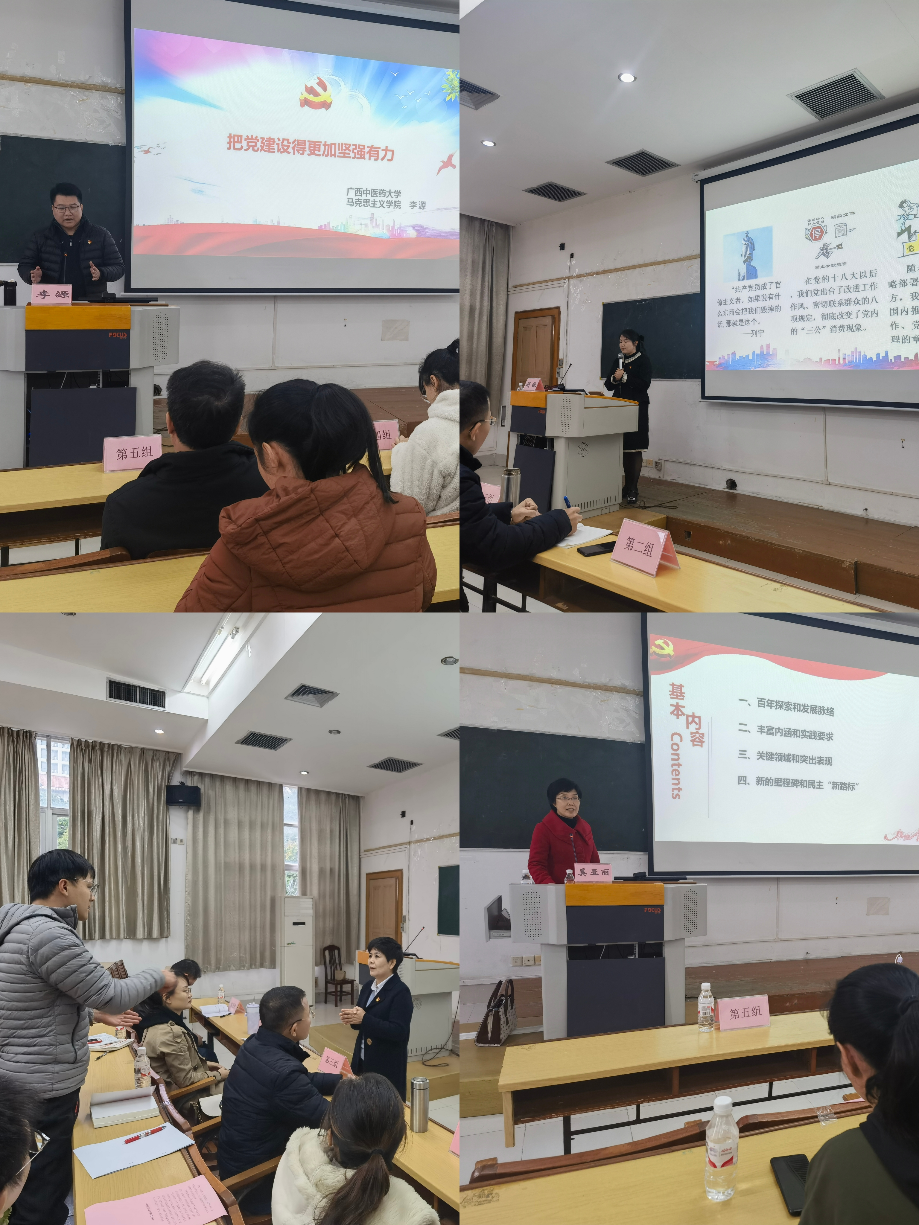 此次培训主要以理论教学现场授课的形式开展,邀请了星空彩票老版本下载校办主任蓝开宝、星空彩票老版本下载马克思主义学院院长韦兆均、副院长李源、副教授奚亚丽以《公文写作与处理》《中国式现代化推进中华民族伟大复兴》《新时代背景下把党建设得更加坚强有力》《加强全过程人民民主》等为题的专题授课。通过运用朴实的语言、生动详实的事例,准确、全面的为学员们讲解,并与学员进行了面对面交流,深刻解读了学习贯彻党的二十大精神,加强党支部工作和全面从严治党工作的重要性、紧迫性和必要性。