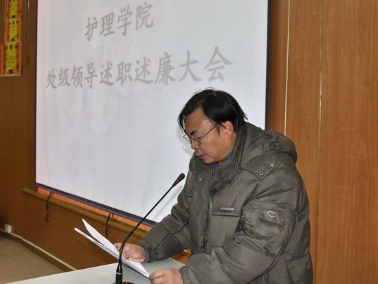 2011年1月15日上午,护理学院在东葛校区多媒体教室召开处级领导述职述廉大会。广西中医学院党委组织统战部副部长唐振宇、副处级组织员蒋子华莅临指导,护理学院全体教职工参加了会议。会议由护理学院党委岑家铭书记主持。