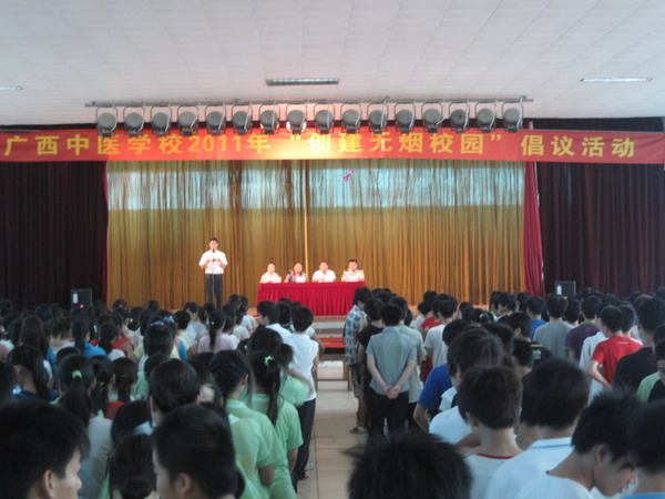 每年的5月31日是世界无烟日。为响应卫生部、教育部最新规定,为创建无烟校园,倡导健康生活,让校园更加和谐美好。广西中医学院附设中医学校将2011年5月30日至6月3日一周定为“世界无烟日”宣传活动周。学校通过校园广播、横幅、电子屏幕、展板、主题班会、现场倡议签名活动等多种形式展开全方位宣传。