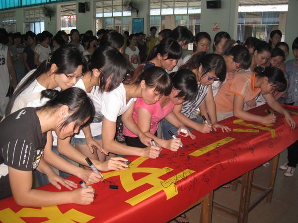 2011年6月3日下午17:30,在北湖校区礼堂举行的“创建无烟校园”倡议签名把本次宣传活动周推向了高潮。出席本次活动的附设中医学校领导有学生科黄勇科长,团委玉锋书记,学生科江育萍副科长,学生科副科长、教官队张世光队长。本次活动议程由黄勇科长致辞,他指出吸烟带来的种种危害、特别强调青少年吸烟和女性吸烟的危害,说明学校校园禁烟、创建无烟校园的重要性和必要性;学生代表发起倡议,为了自身和他人的健康,远离烟草,拒吸第一支烟,做不吸烟的新一代;同学们观看禁烟宣传视频,严谨有力的数据、详实鲜活的事例、吸烟所带来的危害深深震撼着同学们的心灵,大家真正认识到吸烟带来的种种危害,理解学校创建无烟校园的重要性和紧迫性,都踊跃签名承诺不吸烟,并表示认真学习和宣传禁烟有关知识,做一名禁烟宣传使者;以实际行动拒绝吸烟,做不吸烟的新时代青年;积极劝身边的同学、朋友不吸烟,做一名禁烟行动的实践者,让我们的生活更加健康、和谐、美好!