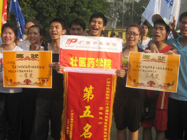 2011年5月28日,广西中医学院于校体育运动场展开了第25届传统保健运动会,我壮医学子勇闯佳绩,荣获团体总分全校第五名的好成绩。