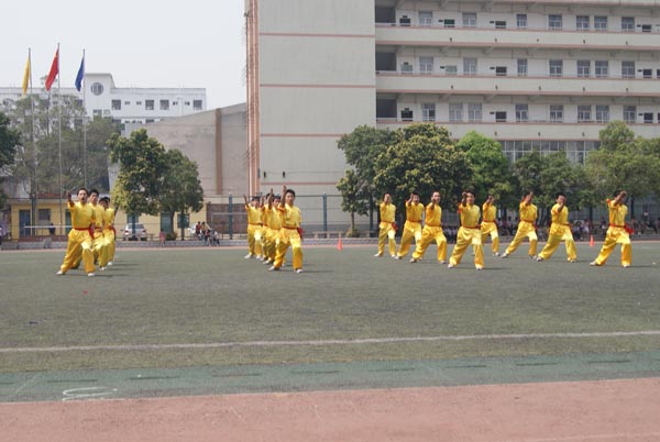 柔金色的飘逸太极服,红色缎带腰间一缠,释放出少年的一腔义气热血。三路长拳比赛伊始,便有无数的少年热血随着比赛音乐而翻腾起伏,一决高下。上届男子三路长拳冠军08壮医的男生们一出场就气势如虹,在猎猎风中衣袂翻飞,未开始但已成气势。待到拳出如风,弹跳间步伐稳健有力,赤红如血的腰带和绑臂随着动作割裂空气,整齐划一的动作引发观众和拉拉队的热烈的欢呼,勃发的热血与朝气感染了在场的每一个人!最后,08壮医再次荣获三路长拳年级第一名!而09壮医也不负众望,摘取了三路长拳年级第四名的好成绩。
