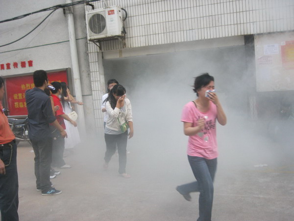 学生有序撤离模拟火灾现场