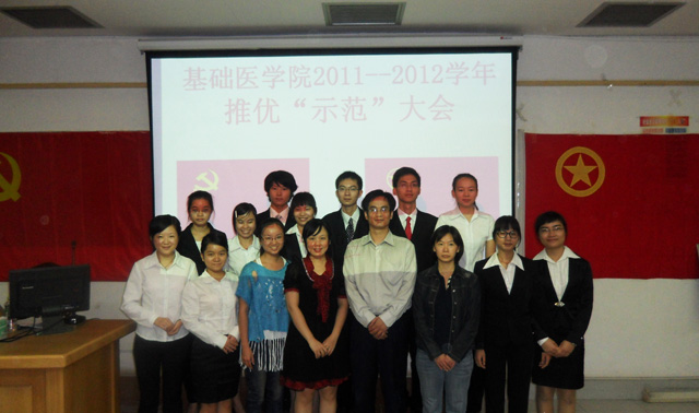 基础医学院2011—2012学年推优“示范”大会于2011年10月16日晚在西梯二教室举行。本次大会由2009中医学(传统方向)团支部担任示范团支部。学院党办、2009中医学(传统方向)班主任李朝晖等老师以及校团委、学生会、各二级学院分团委代表、基础医学院各团支部的团干、班级代表及基础医学院分团委学生会全体委员出席本次大会。
