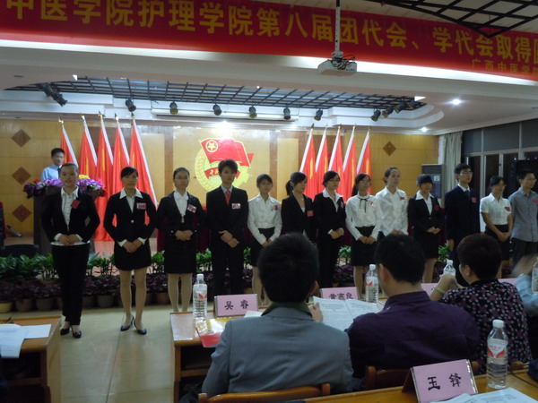 2011年10月27日19:00,共青团广西中医学院护理学院在大学生俱乐部隆重召开了第八次团代学代会。出席此次会议的领导老师有广西中医学院学工部部长学工处处长冼锦华老师、护理学院党委书记岑家铭老师、校团委副书记王春花老师、人文社科学分团委书记刘玲老师、壮医药学院分团委书记陈晓丽老师、研究生学院分团委书记杨思源老师、护理学院学工办主任许凤琼老师、护理学院分团委书记玉锋老师,以及护理学院学工办各位老师,此外,分团委学生会的正式代表、候选人以及各班代表共200多人也参加了本次大会。