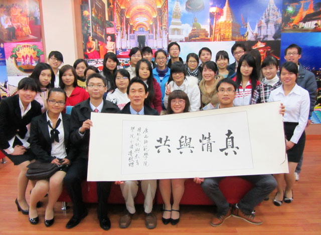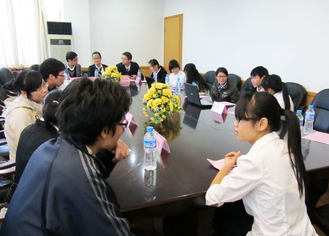 交流会上,两院的负责人分别就本院分团委的组成及其部门工作情况做了详细的介绍。国际文化与教育学院分团委上届副书记石佳俊列举了其分团委自2008年成立以来所取得的成绩以及不断完善的团队工作理念;我院的学生会主席叶挺也就我院分团委的工作特色及近期所取得的成绩做了总结,充分展示了我院分团委的部门特色与优势。在本次活动的经验交流环节中,我们双方就“如何打造品牌团日活动”进行了讨论,现场气氛十分活跃,大家受益颇丰。接着,由国际文化与教育学院学生会副主席郭敏红同学带领我们参观了师范学院的特色专业展厅——泰语中心,让我们感受了来自泰国文化的奥妙精深与专业特色。最后大家合影留念。