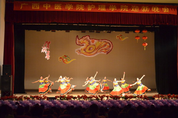 广西中医学院护理学院“玉兔呈祥,金龙贺岁,以心迎新,欢庆元旦”文艺晚会于2011年12月26日19:30在广西交通职业技术学院大礼堂隆重举行。出席此次晚会的嘉宾有:广西中医学院学工部部长、学工处处长冼锦华,护理学院党委书记岑家铭,院长吴彬,副院长周琦、林原及护理学院全体老师。担当此次晚会的评委老师有:蔡正华、戴黎霞、赵英、覃梦岚和梁宝桐。