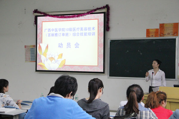 2012年4月6日,高等职业技术学院分别在校本部和订单单位组织召开了高职订单班《综合技术培训》开课暨实习动员会,邀请学校教务处、招就处、学工处领导及订单单位的老师对2010级针灸推拿、医疗美容技术订单班学生进行实行动员和岗前培训。按照《广西中医学院高职专业培养方案》的教学计划,高等职业技术学院2010级针灸推拿、医疗美容技术订单班学生将于进点实习前进行为期近一个月的综合技能培训,并于4月底进入订单单位实习。
