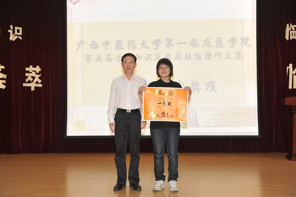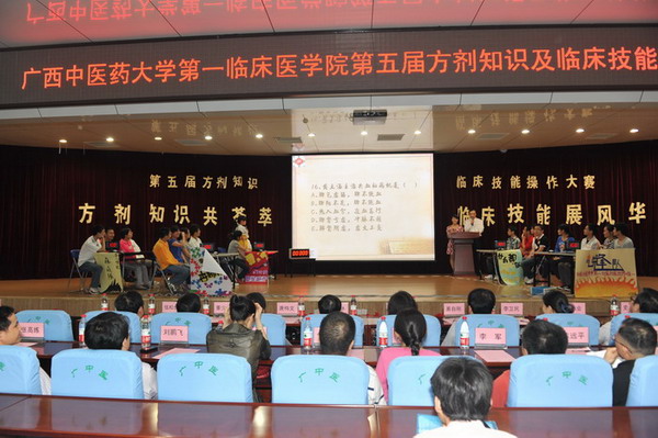 在第一轮的方剂知识竞赛必答及抢答环节中,各班级同学们团结协助,展现出了扎实的方剂基础知识及勇往直前的拼搏精神,07对外以190分的优势领先。在接下来进行的临床技能操作环节把大赛推向高潮,通过电脑随机产生的上场选手在比赛过程中各显其技,充分发挥了合格医学生所应具备的基本临床技能操作水平,得到了在场评委老师及同学的肯定。 最后,07对外班一枝独秀,技压群雄,荣获冠军并获得最佳组织奖,08针推荣获二等奖,08传统、08中医和08壮医并列三等奖。