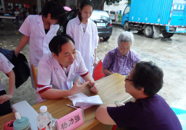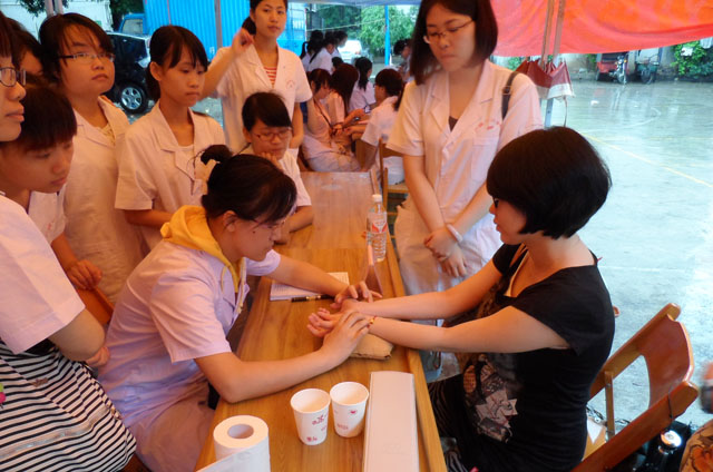 基础医学院刘燕平教授、杨力强博士、张静博士和贾微老师分别在明秀二区和衡阳南社区坐诊,免费为居民们把脉开方,中医、对外、骨伤等专业学生参加了义诊服务。其间,大雨倾盆而下,但不管是烈日当空还是大雨倾盆,都无法阻挡基础医学院师生志愿服务的热情。此次义诊除开设专家坐诊、艾灸推拿、血压测量、保健宣传等项目外,还应居民要求,增设了“义诊服务送上门”这一项目,使行动不便的居民也得到服务,颇受好评。