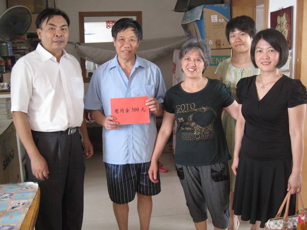 护理学院党委书记岑家铭(左一)、副书记罗艺徽(右一)到廖晓林老师家慰问