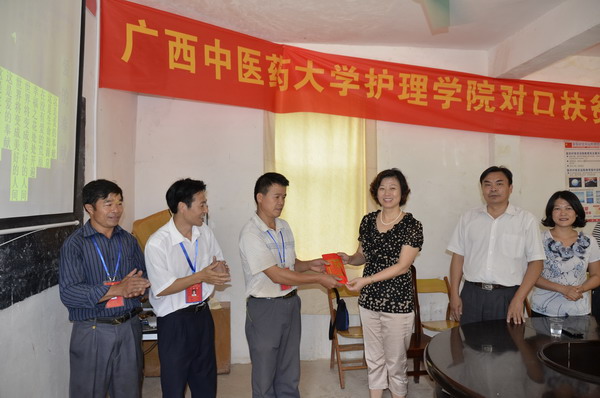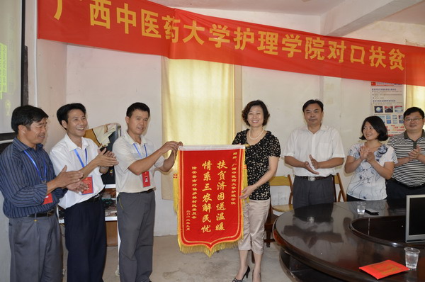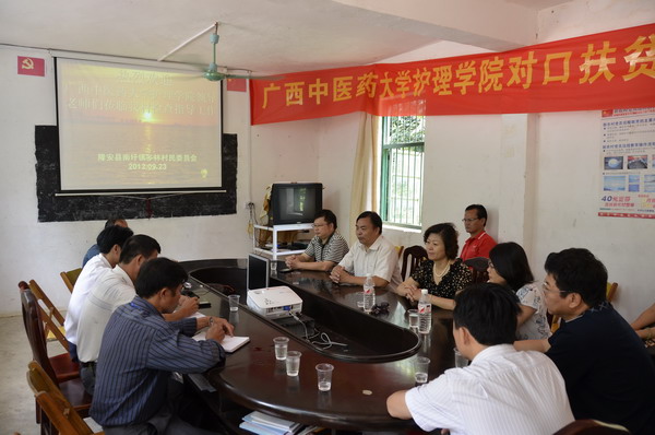 2012年9月23日,护理学院党委书记岑家铭、院长吴彬、副书记罗艺徽和副院长林原带领部分科室负责人慰问我院委派到广西贫困村——隆安县多林村担任第一书记的张义欢同志,并与帮扶的多林村两委共商开展扶贫、脱困、致富大计,受到多林村两委班子成员的热情接待,并专门举行了座谈会和对口扶贫资金捐赠仪式。