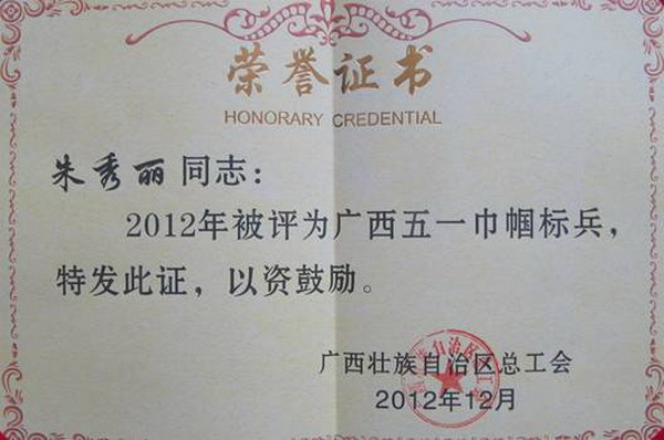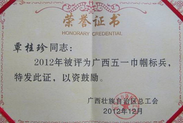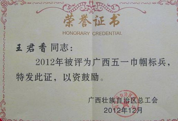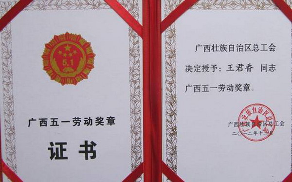 王君香、覃桂珍、朱秀丽等同志长期默默无闻工作在养老工作第一线,在平凡的岗位上做出了不平凡的业绩,她们热爱护理专业、钻研护理技术,王君香经广西总工会评定授予“广西五一劳动奖章”及“广西巾帼标兵”荣誉称号,覃桂珍及朱秀丽荣获“广西五一巾帼标兵”荣誉称号。