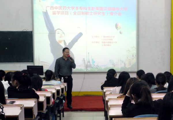 2013年4月26日,人文社科学院分别在赛恩斯新医药学院阶梯教室和星空彩票老版本下载明秀校区西梯一教室举行了两场赴英国贝德福特大学攻读全日制硕士研究生项目推介会。人文社科学院党总支书记李怀泽、院长韦兆钧、副院长王碧艳、英国贝德福特大学上海办事处官员柴婷婷女士及人文社科学院相关老师应邀出席。