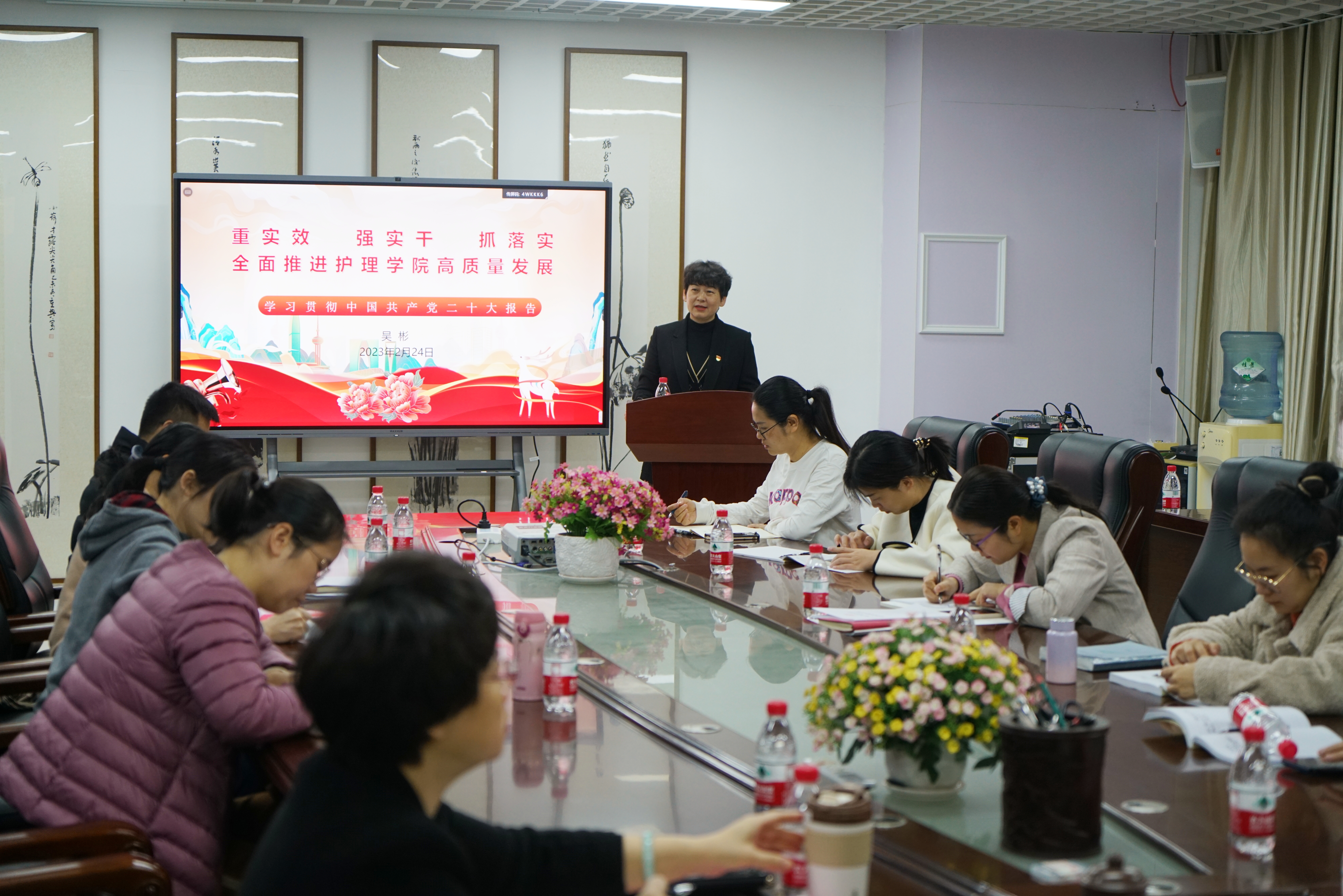 会议首先由学院党委书记、院长吴彬作“重实效、强实干、抓落实,全面推进护理学院高质量发展”学习贯彻党的二十大精神专题报告。报告中吴彬分别对党的二十大简况、二十大报告重点进行了解读,结合报告中对教育提出的高质量发展要求,强调了践行“立德树人”的根本任务和要牢固树立“战斗力”是唯一的根本标准。