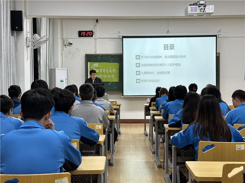 为了迎接新学期,学习深入贯彻党的二十大精神,引导同学们把思想和行动统一到党的二十大精神上来。3月12日晚,第一临床医学院2020级中医学1班在明秀校区召开“开学第一次主题班会”。班会邀请了第一临床医学院党委副书记、副院长钟远鸣参加。学院教学党总支书记、辅导员、班主任参加了本次班会。班会由辅导员宁英海主讲。