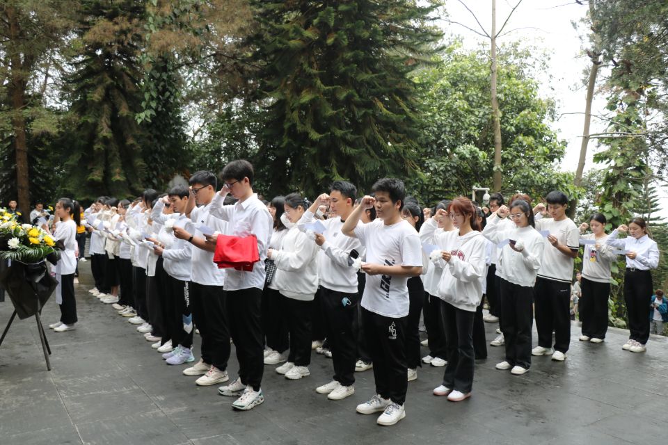 烈士纪念碑前,奏唱《英雄赞歌》后,全体成员默哀一分钟,学生代表向革命烈士敬献花圈。学生党员代表覃星颗及团员代表黄春霖进行发言,倡议当代大学生应时刻铭记历史,奋发向上,以昂扬斗志投身到中国式现代化建设中,为实现中华民族伟大复兴贡献青春力量。随后进行集体宣誓,最后以敬献白花的方式表达对先烈的深切怀念。