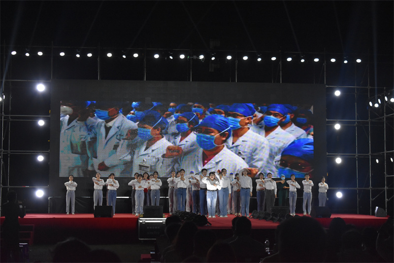 在药学院同学们悠扬的歌声中,主持人宣布晚会正式开始。随着婉转的旋律响起,瑞康临床医学院学生团总支学生会朝气蓬勃的同学们款款走上舞台,自信地完成手语动作,前排则闪过一幕幕现实中动人的情景短剧:有术后劳累的医生们温情的相互激励,有对病人体贴入微的医护工作者,有因疫情无法紧握双手而用手肘相碰的医生们,有无私奔走在各处需要驰援的青年志愿者们……现场大屏幕上,一张张照片展示着我院老师与同学们驰援各地的坚毅身影,伴着音乐闪过,无数个微光的艰辛时刻,在这一刻,汇成了一首英雄的赞歌。