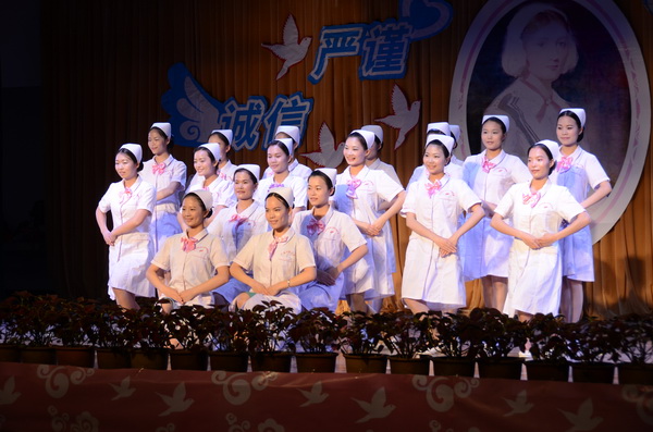 吴彬院长代表学校发表了热情洋溢的讲话,对全体护理专业师生致以节日的问候,接着重在《同一首歌》乐曲的伴奏下,庄严的授帽及宣誓仪式开始,整个庆祝活动也推向了高潮,在护理学创始人南丁格尔像前,我院领导、附属医院的护理部主任为护生们授予圣洁的燕帽。护理老前辈点燃手中的红烛,映衬着盏盏烛光,护生们手捧着蜡烛庄严宣誓:“接过前辈手中的蜡烛,燃烧自己,照亮别人”,烛光在传递,希望与奉献在升华,代表了全体护生对护理事业的无悔选择和执著追求与不辱白衣天使神圣使命的决心。