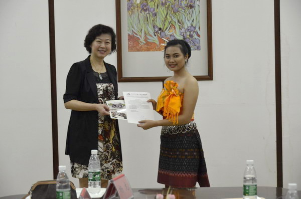 最后,吴彬院长为泰国交换生颁发了学习证书,双方互赠礼物并合影留念。