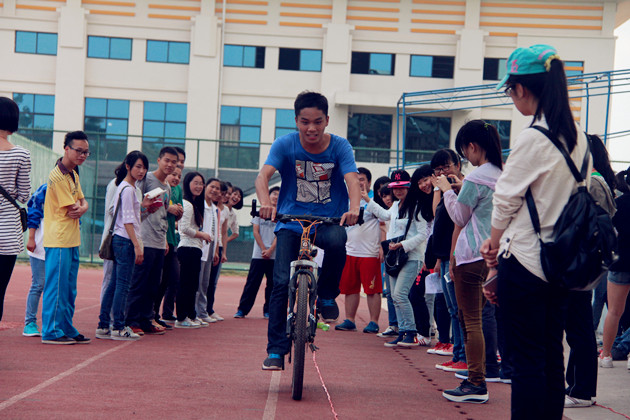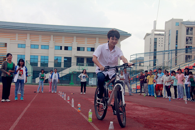 第二轮“自行车慢骑”比赛,各参赛队在长10米的直线赛道上完成接力。各个队员想方设法保持慢节奏的骑行,队员表演了精彩的慢行绝技,赢得啦啦队一阵阵欢呼与喝彩。即使因脚尖触地受到每次减时10s的惩罚,参赛队员也不亦乐乎。