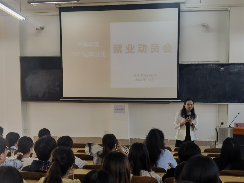 为深入学习贯彻党的二十大精神,落实党中央、国务院“稳就业”“保就业”决策部署,护理学院于11月1日在明秀校区举行了2024届毕业生就业动员会。