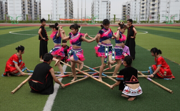 壮医药学院“壮族传统民俗文化”活动由壮族竹竿舞欣赏和壮族传统体育竞赛两个部分组成。在欢快的壮语山歌中,具有壮族特色的竹竿舞拉开了活动的序幕,鲜艳、 美丽的壮族服饰和清脆、响亮的竹竿声引人耳目。而“疯狂的竹竿“、板鞋竞走、背篓接绣球等这些具有浓郁壮族特色的竞赛项目,更是获得了周围学生们的阵阵掌 声。
