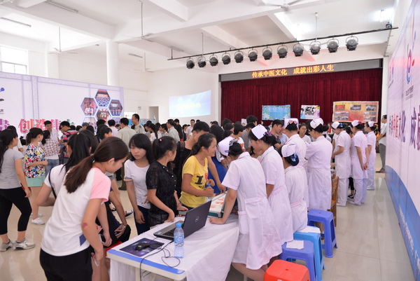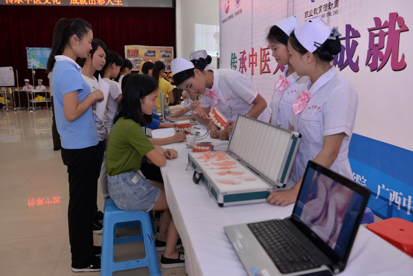 在广西中医学校北湖校区,学校开放了护 理、中医、中药、康复、针灸推拿等实训中心,由讲解员负责带队,按照计划线路进行参观,参观人员可以近距离感受学校在实训基地建设的成绩。此外,学校在大礼堂布置职业技能展示区、德育成果展示区等,以多种形式、全方位、多角度展示我校办学成果。在职业技能展示区,来宾们可以体验拔火罐、艾灸、推拿等中医技 法技能,也可以了解口腔护理、生命的奥秘等医学知识,还可以学习心肺复苏等急救知识。学校岐黄协会、天使协会、弘毅醒狮团、动漫社等优秀社团的才艺展示也吸引大量来宾驻足欣赏。