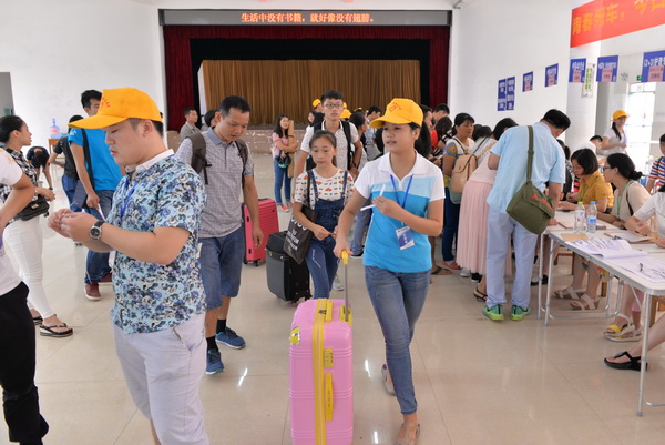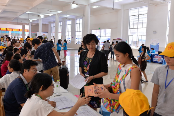 一大早,在校内外各个接待点的老师和志愿者们各就各位。新生来了,只见志愿者们满脸笑容上前帮提行李,细致回答新生和家长的疑问,有条不紊的引领新生完成报 到的所有程序。大家都始终坚持奋战在自己的岗位上,忙得不亦乐乎。一整天下来,全体工作人员配合无间,整个迎新过程都井井有条,大家都表示,累并快乐着。