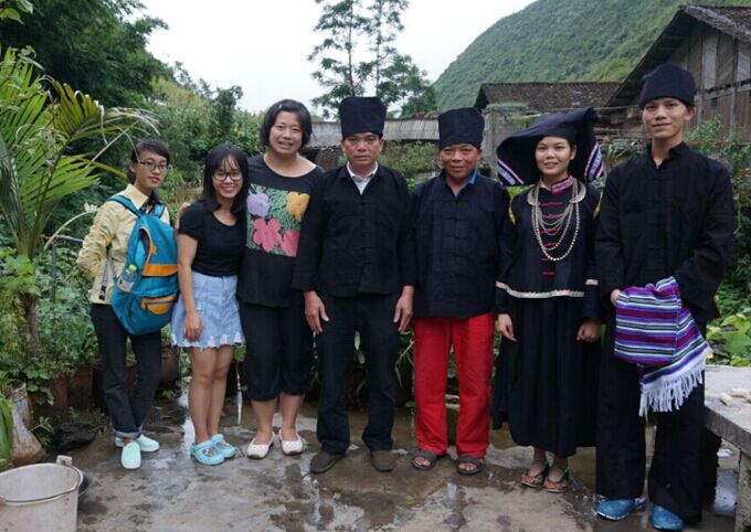 学生穿上黑衣壮传统服饰在那坡城厢镇吞力屯与村民们合影