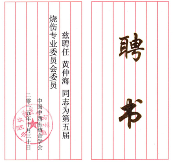 黄仲海主任医师被聘为中国中西医结合学会第五届烧伤专业委员会委员