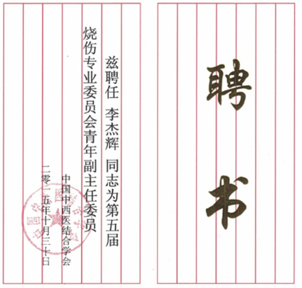 李杰辉副主任医师被聘为第五届烧伤专业委员会副主任青年委员、副秘书长