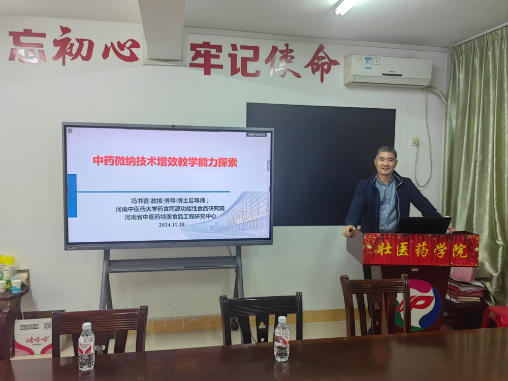 11月30日下午,壮医药学院和瑶医药学院邀请了河南中医药大学冯书营教授莅临我校,带来了一场主题为“中药微纳技术增效教学能力探索”的精彩学术讲座。