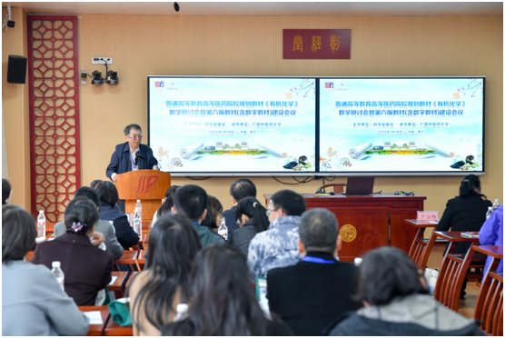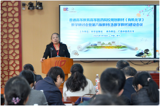 全国医药院校“十四五”规划教材《有机化学》主编、北京中医药大学吉卯祉教授详细回顾了教材的发展历程,强调每一版的更新都紧跟中医药教育的发展步伐,并提出了新版教材应融入最新研究成果、优化教学内容和增强实践导向的具体要求。科学出版社郭海燕编辑接着阐述了出版社在高质量教材出版方面的专业支持,包括严格的质量管控、数字化资源开发以及专业团队的支持,致力于为教师和学生提供更先进的学习工具和更丰富的教学资源。