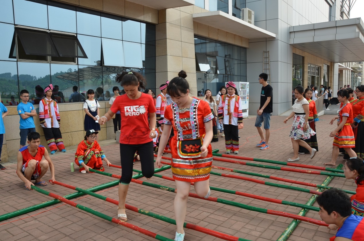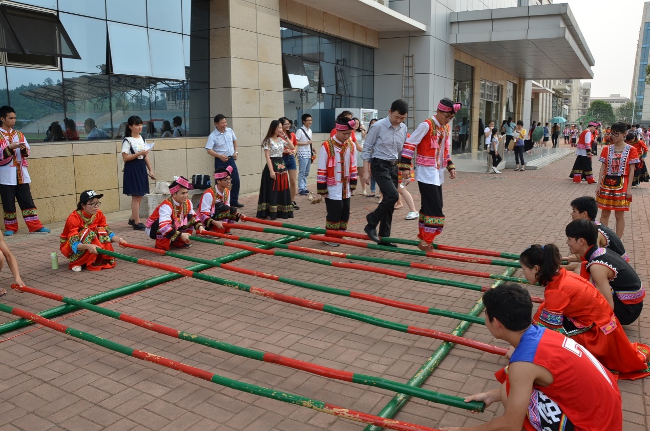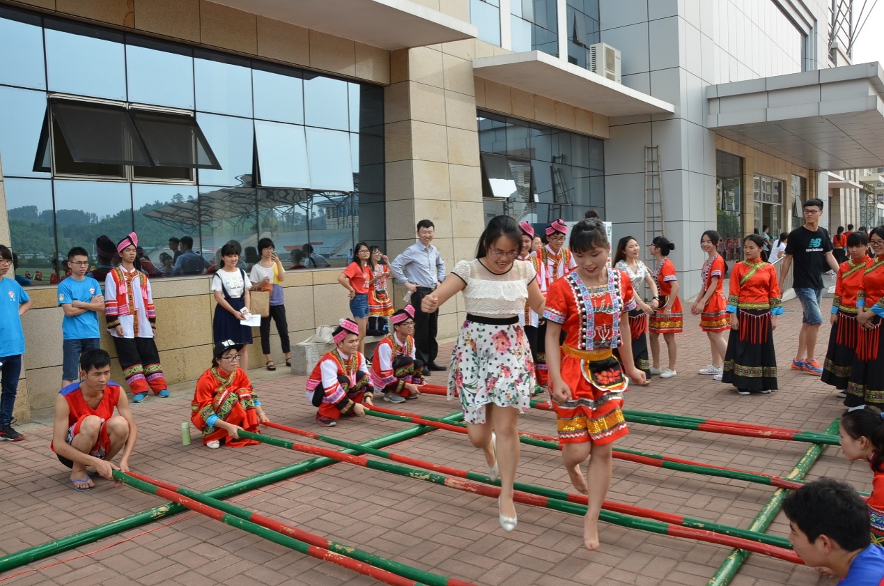 领导、老师和同学们在比赛中享受竹竿舞的欢乐