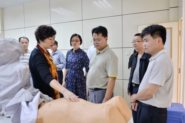 崇左市江州区卫生和计划生育局领导一行在广西中医学校校长吴彬陪同下参观了位于北湖校区的实训中心并进行交流座谈。座谈会上,吴彬校长代表党政班子对崇左市江州区卫生和计划生育局领导一行的来访表示欢迎,并就学校办学特色、专业设置及毕业生就业等情况作了简要介绍。黄朝圣局长也对广西中医学校的热情况接待表示感谢,并表示今后在人才培养上与我校加强沟通。黄局长一行还实地考察校办产业——广西重阳老年公寓。