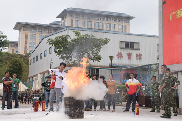 随后,消防官兵就消防法规、火灾危险性及预防措施等内容进行了详细的讲解。为使同学们更直观了解和应对火灾事故的现场,消防官兵现场为师生职工讲解了常见消防器材的使用方法、如何关闭泄漏着火的煤气罐,并指导师生员工轮流使用灭火器进行灭火演练。