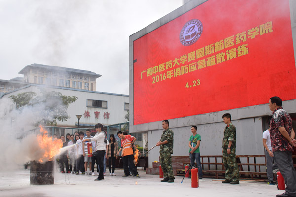 为进一步加强赛恩斯新医药学院消防安全管理“四个能力”建设,增强师生职工消防安全意识以及火灾自救互救能力,赛恩斯新医药学院于4月23日上午组织开展2016年春季学期消防应急疏散演练。赛恩斯新医药学院后勤保卫处、教务处、学工处、实验教学中心、食堂及物业工作人员、学生等1000余人参加本次演练,并邀请青秀区武警消防中队消防官兵前来指导。赛恩斯新医药学院叶绘晟副院长全程参加、指导演练活动。