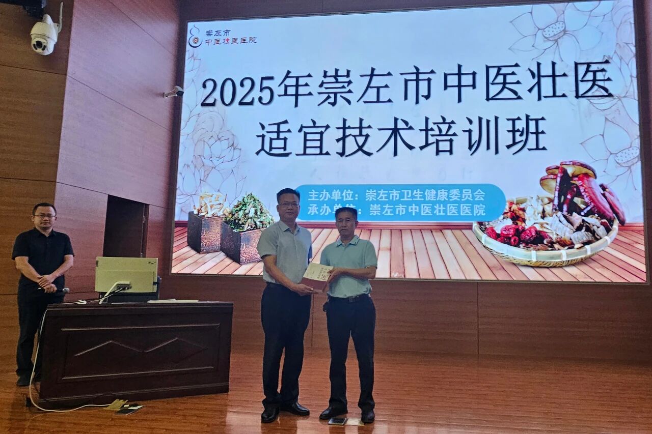 学术讲座开始前,韦英才还向崇左市中医壮医医院医务人员代表赠送书籍《壮医筋结病灶图解》,以期助力基层临床应用与学术研究。