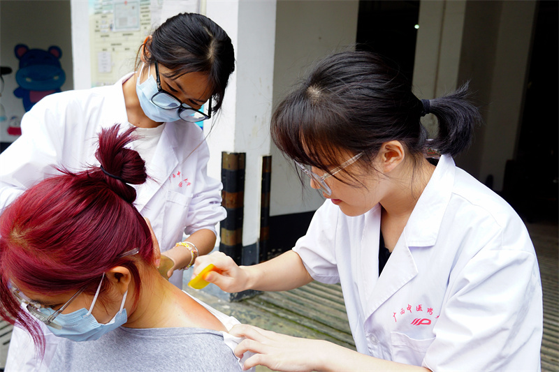 当日上午,志愿者们早早来到五村岭社区布置场地,设置血压测量区、艾灸区、刮痧区、手法推拿区等,吸引了众多居民前来参与。在血压测量区,志愿者们为社区居民提供免费血压检测服务,并结合测量结果给予居民科学实用的健康建议;艾灸区和手法推拿区格外受到中老年居民的欢迎,志愿者们充分发挥所学的专业技能,有效缓解了居民们常见的肩颈酸痛、腰腿不适等症状;在刮痧区,志愿者们手持刮痧板,按照中医经络理论,在居民的肩背、颈部等部位进行专业操作。操作过程中,志愿者们还不断叮嘱居民刮痧后要注意保暖、避免受凉,以及短期内不宜洗澡等细节。不少居民在体验后,纷纷表示身体舒爽了许多,对志愿者们专业又贴心的服务赞不绝口。