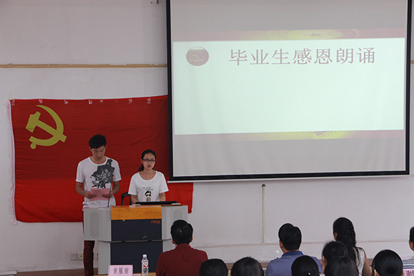 大会的第二部分还有重温入党誓词,让全体党员重新感受入党时的信念及初衷;毕业生党员诗歌朗诵——《今天,我们毕业了》饱含全体党员对大学生活的酸甜苦辣之感以及对母校、对老师深深的感激及不舍之情;党员代表发自内心的发言代表了全体党员对同学、对老师、对母校的感激之情。
