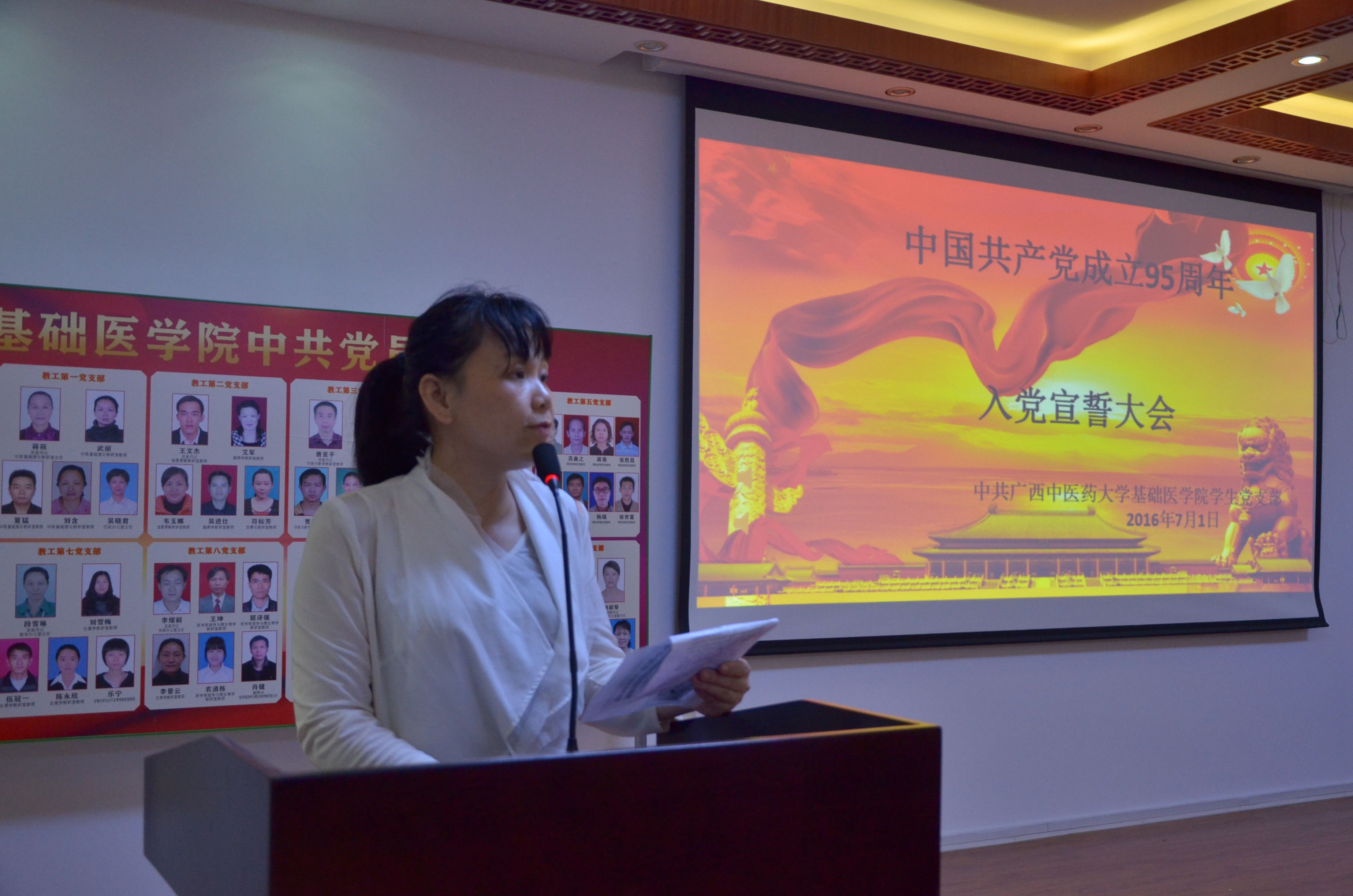 为热烈庆祝中国共产党建党95周年,为引导广大党员同志充分践行“两学一做”精神,激发广大大学生党员要勇敢面向未来,敢于挑战,不忘初心,做时代奋进者、开拓者和奉献者的信心,用实际行动为实现中华民族伟大复兴的中国梦共同打拼。基础医学院学生党支部在校党委、院党委的指导下,于2016年7月1日在基础医学院会议室召开“不忘初心,做时代奋进者”为主题入党宣誓大会。基础医学院党委副书记、副院长杨美春,基础医学院党委副书记龙春莉,基础医学院学生工作办公室老师杨丽琴、和卫宾、张锐以及学院全体党员参加本次大会。。