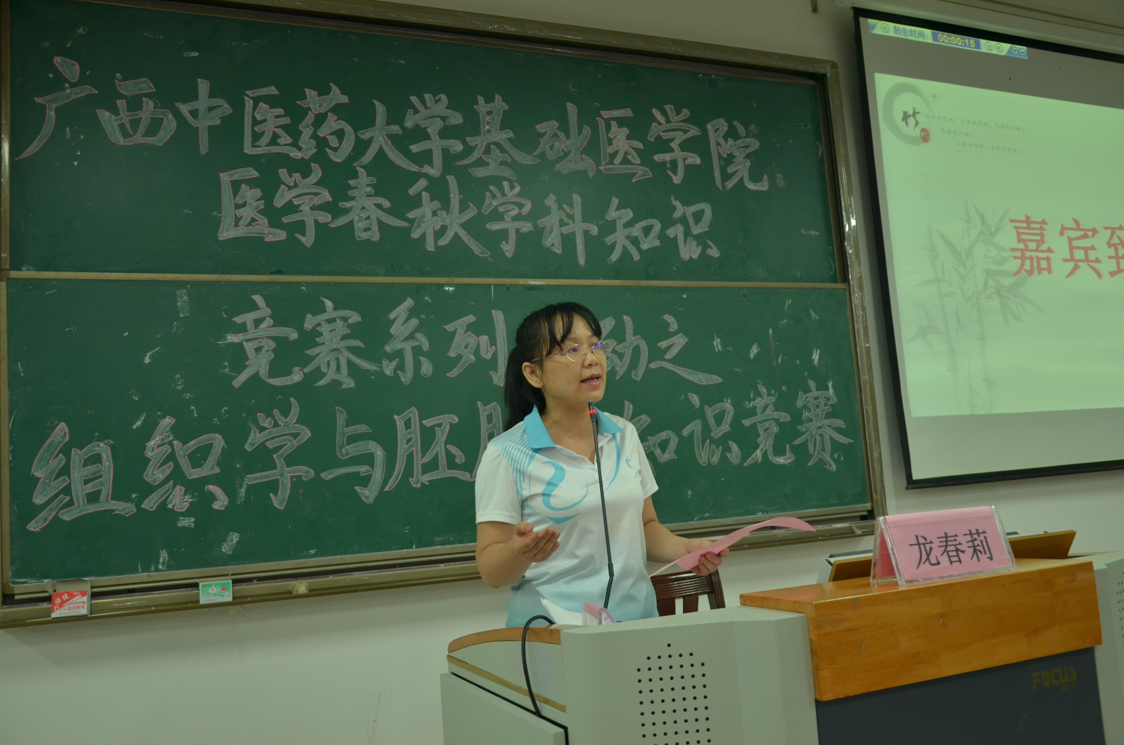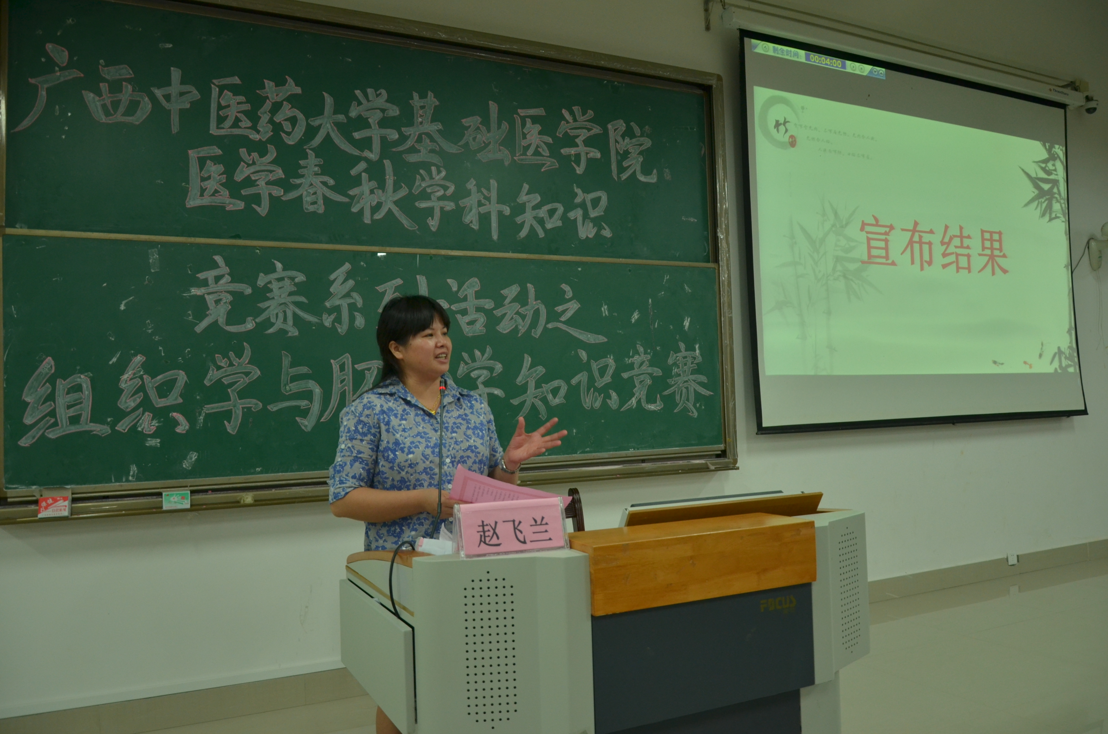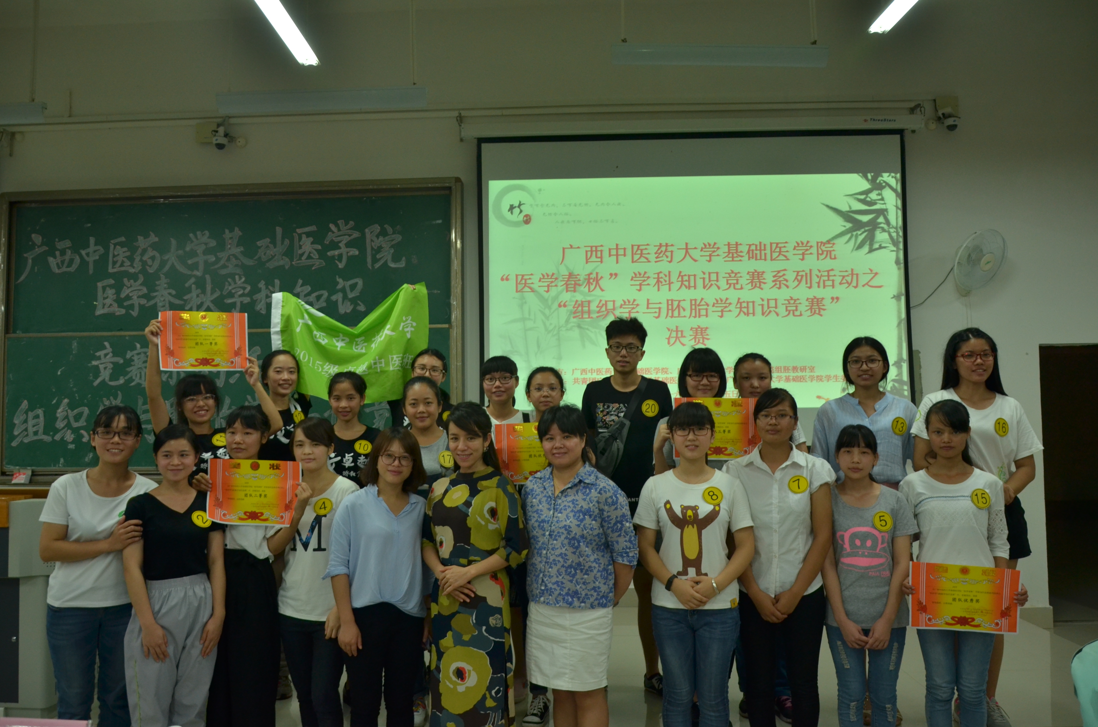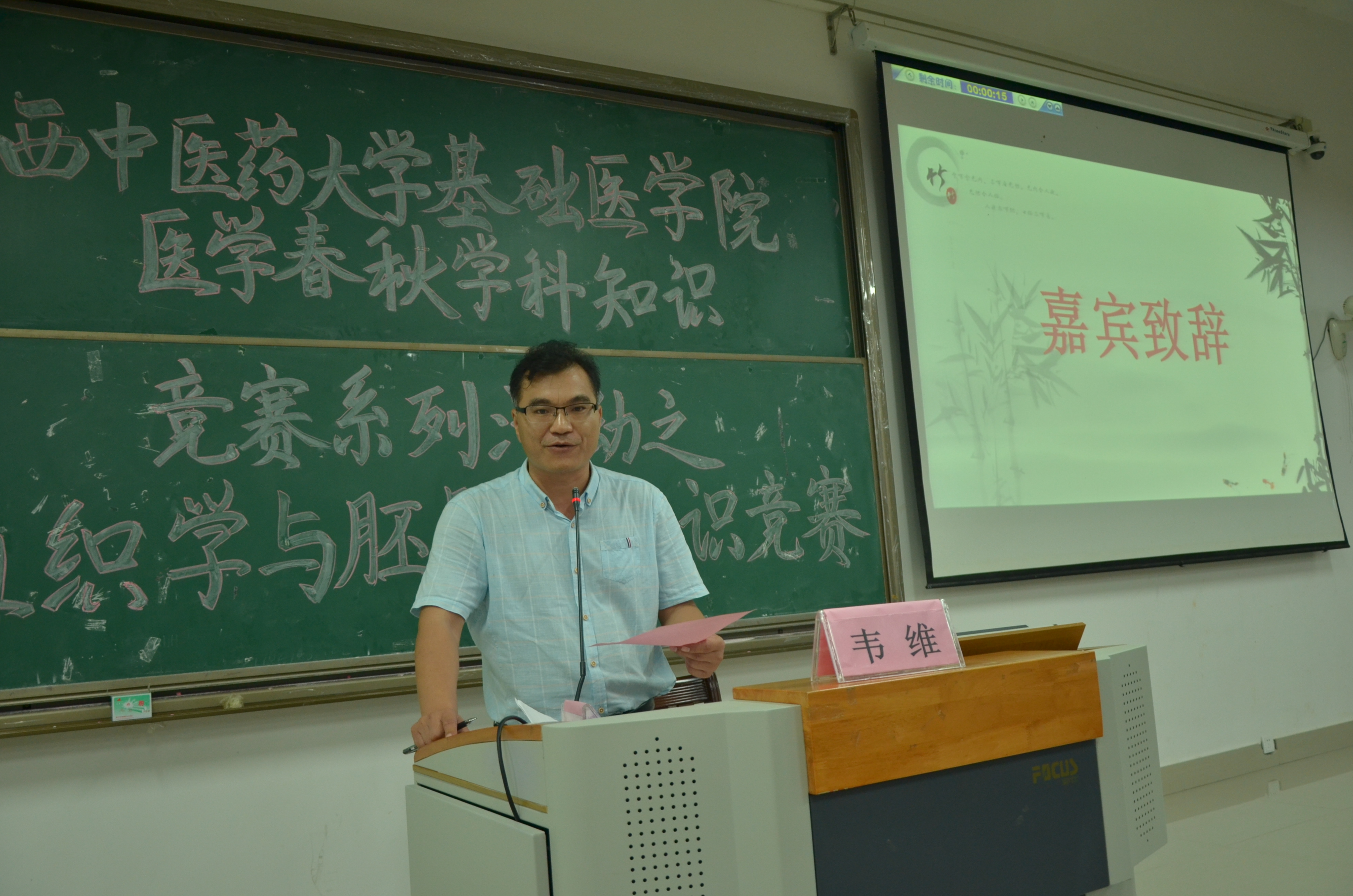 为了巩固并丰富同学们的组织学与胚胎学的学科知识,营造浓厚的学科知识氛围。10月25日晚,基础医学院在仙葫校区教学楼1-101教室成功举办了“医学春秋”系列活动之组织学与胚胎学学科知识竞赛决赛。学校教务处副处长韦维、基础医学院党委副书记龙春莉老师、校学工处办公室主任莫莉丽老师,校团委黄英老师,学工处挂职龚闪闪老师,基础医学院学办杨丽琴老师、和卫宾老师出席本次活动。基础医学院组胚教研室赵飞兰老师和岑妍慧老师担任本次比赛评委。