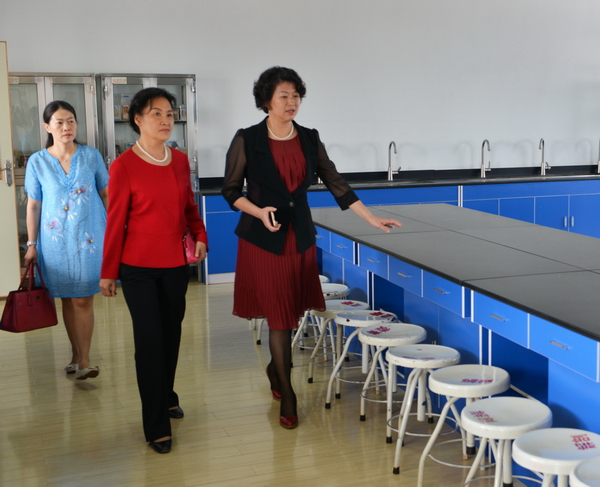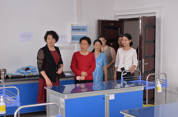 洪净巡视员(左二)在吴彬院长(左一)的陪同下参观仙葫校区护理实践教学基地