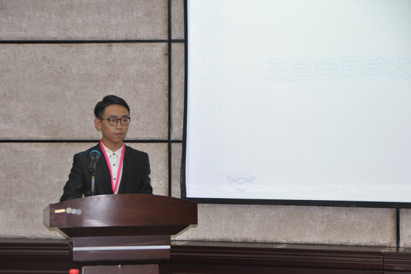 随后,王昌定同学上台发言。他首先对学院领导、指导老师蓝帜及其他在场的师生表示感谢,同时分享了演讲比赛的经验。最后王昌定同学表态他将会以一颗平常心对待接下来的全国总决赛,争创佳绩。会上,老师和同学们还一起观看了学通社制作的专题片,记录了学通社的成长印记以及同学们所取得的成绩,同时奉上大家对王昌定同学的祝福。
